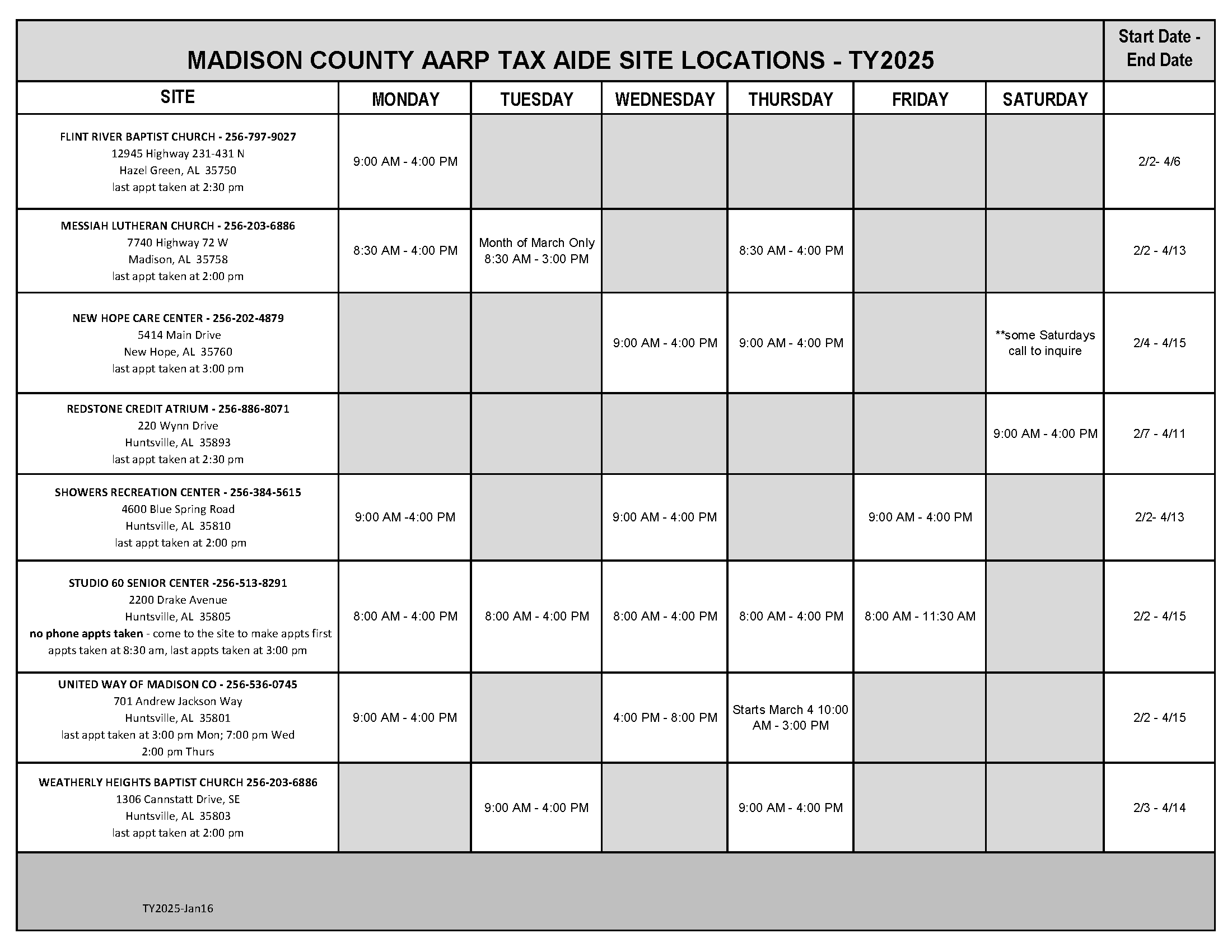 Below is a list of our other seven tax sites in Madison County. You will need to call each of them directly to make an appointment. If you click here, you will get a PDF file you can print.
